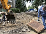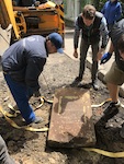 This headstone and more than a hundred others were recovered from under the asphalt paving of vul. Hanna Barvinok southwest of the Lviv city center over several days in June 2018, in a volunteer event organized by the Sholem Aleichem Jewish Cultural Society of Lviv and the Lviv Volunteer Center. The stones were then moved to the new Jewish cemetery adjacent to the Yanivskyi Cemetery northwest of the city center, from which they were likely originally stolen during the German occupation of World War II.