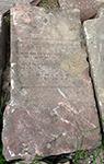 the stone is mostly intact but damaged and worn; parts of the epitaph are covered in soil and illegible