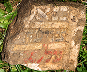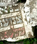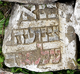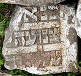 only a small irregular and soiled fragment of this stone survives, making interpretation of the epitaph difficult; traces of paint remain on the Hebrew letters, with the likely name of the deceased highlighted in red color