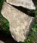 only an irregular and very soiled fragment of this stone survives, in fair condition with traces of red and black/blue paint remaining on the Hebrew letters and the inscription frame