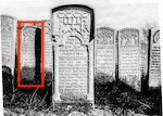 The headstone image seen here is an excerpt from what is believed to be a prewar photograph of Rohatyn’s old Jewish cemetery, from a collection created by Tomasz Wiśniewski, used here by permission granted to Rohatyn Jewish Heritage. All of the stones in these photographs were stolen from the old cemetery for use in road construction during the German occupation of Rohatyn in WWII; to date none have been recovered, and all remain missing.